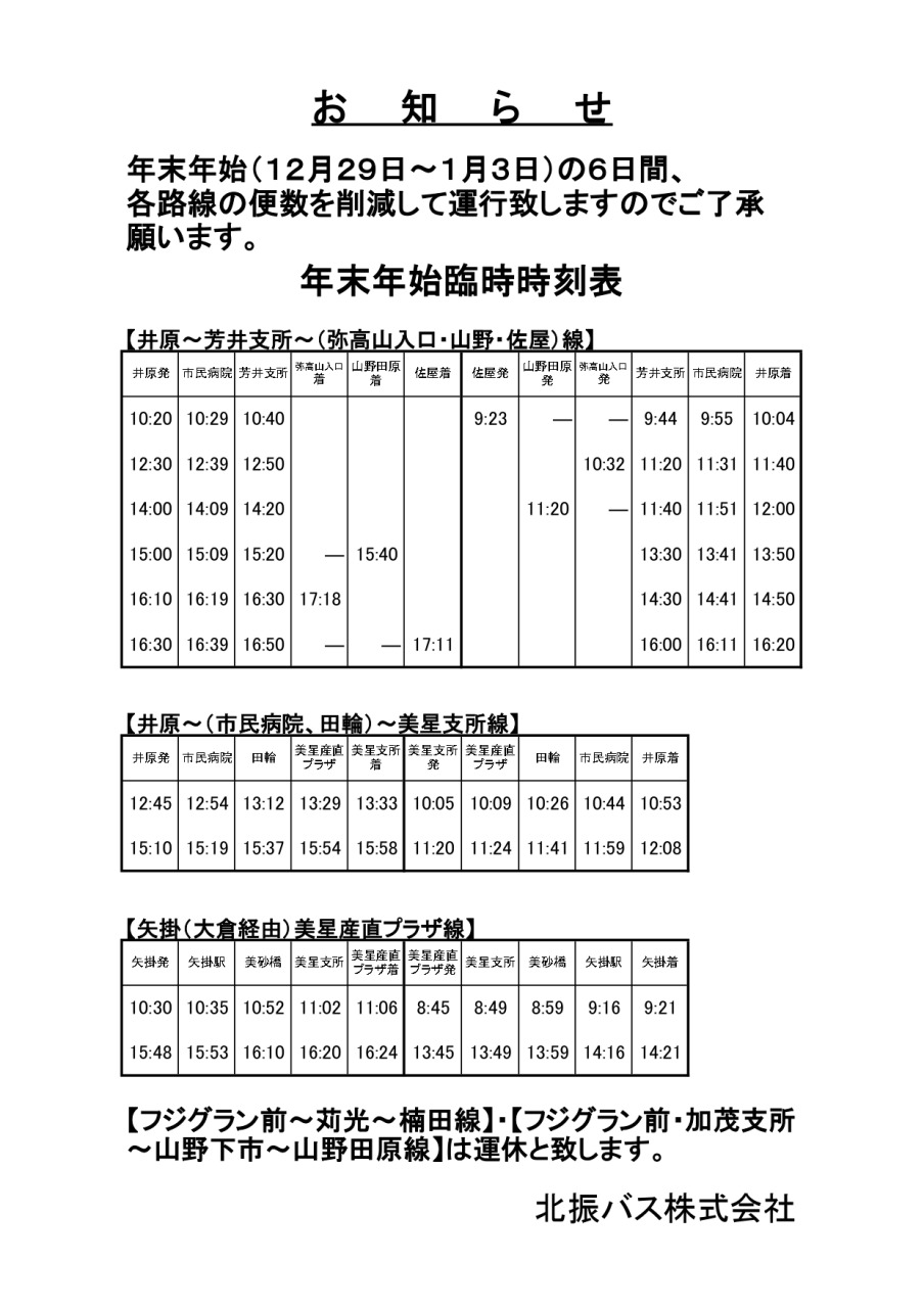 令和4年12月29日~令和5年1月3日の路線バスは特別ダイヤにて運行致します。