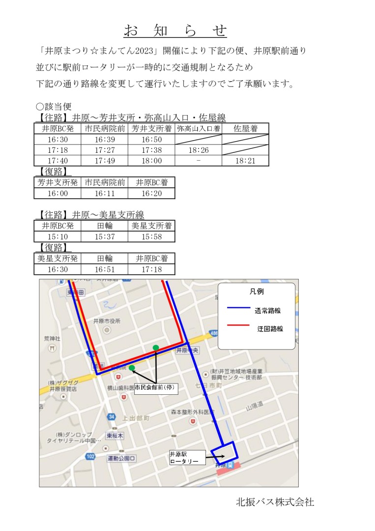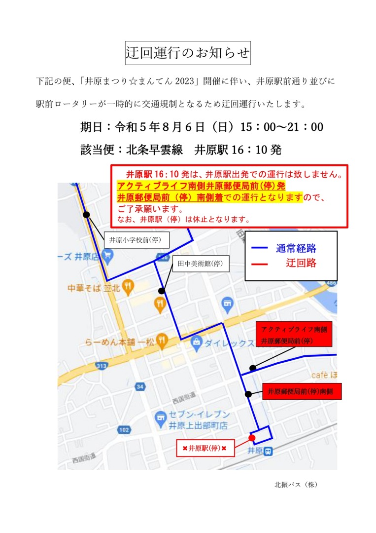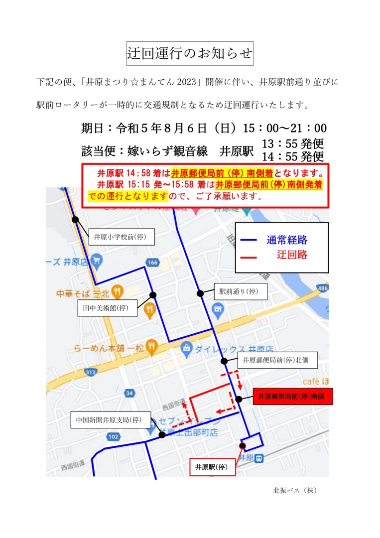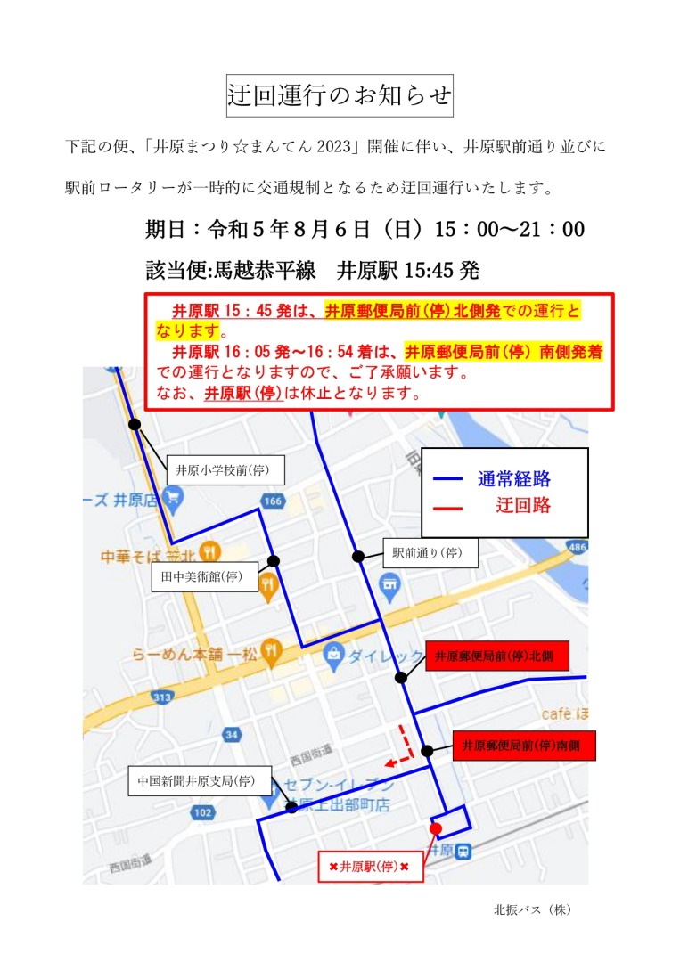 令和5年8月6日(日)に開催される「井原まつり☆まんてん」のため一部迂回運行致します。
