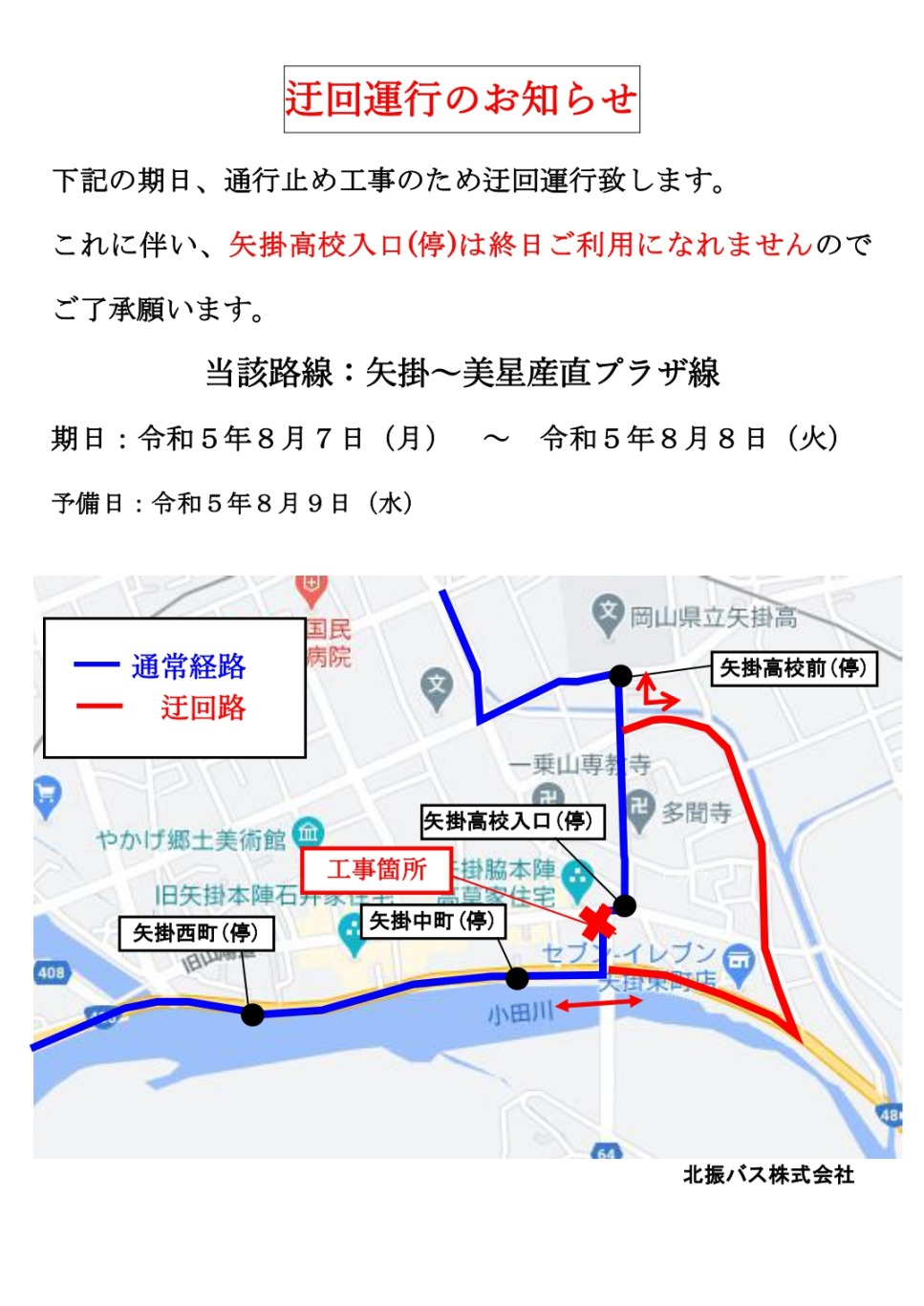 令和5年8月7日(月)~令和5年8月8日(火)(予備日:8/9)に通行止め工事のため一部迂回運行を致します。