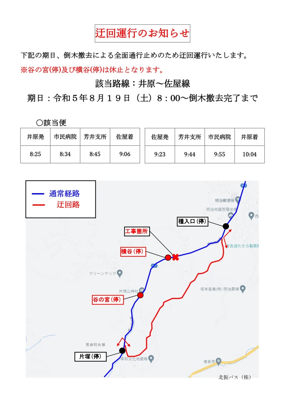 令和5年8月19日(土)に倒木撤去による全面通行止めのため迂回運行を致します。