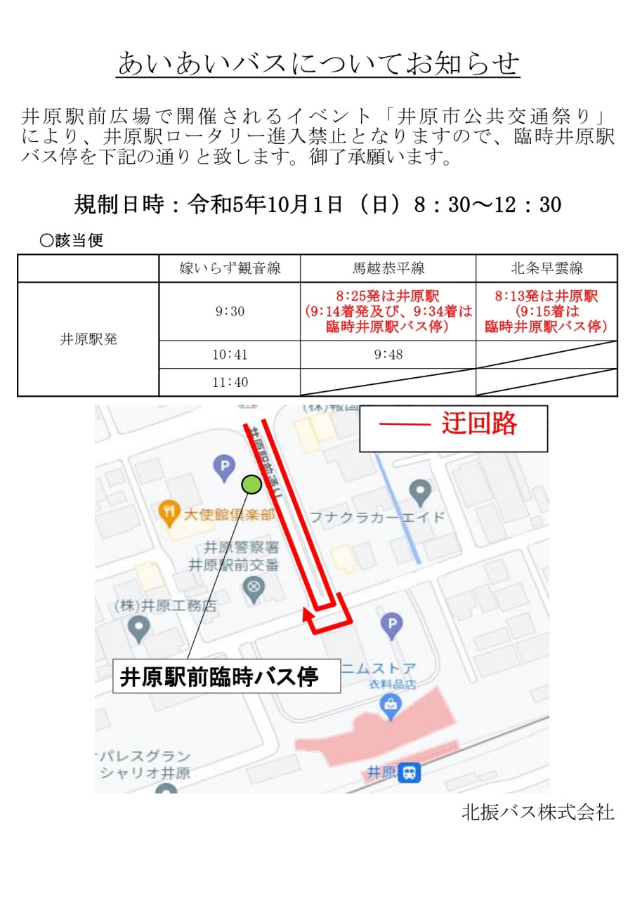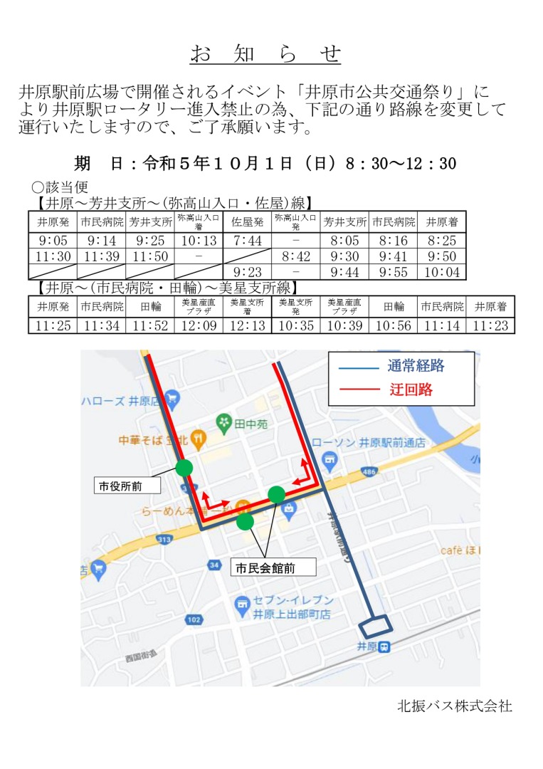 令和5年10月1日(日)に開催される「井原市公共交通祭り」のため一部迂回運行いたします。