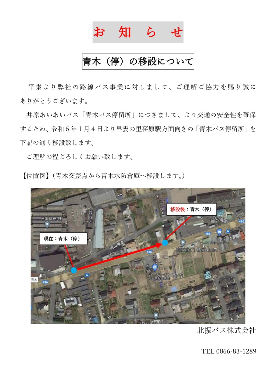 令和6年1月4日より青木停留所(早雲の里荏原方面向き)を移設致しますので、ご了承願います。