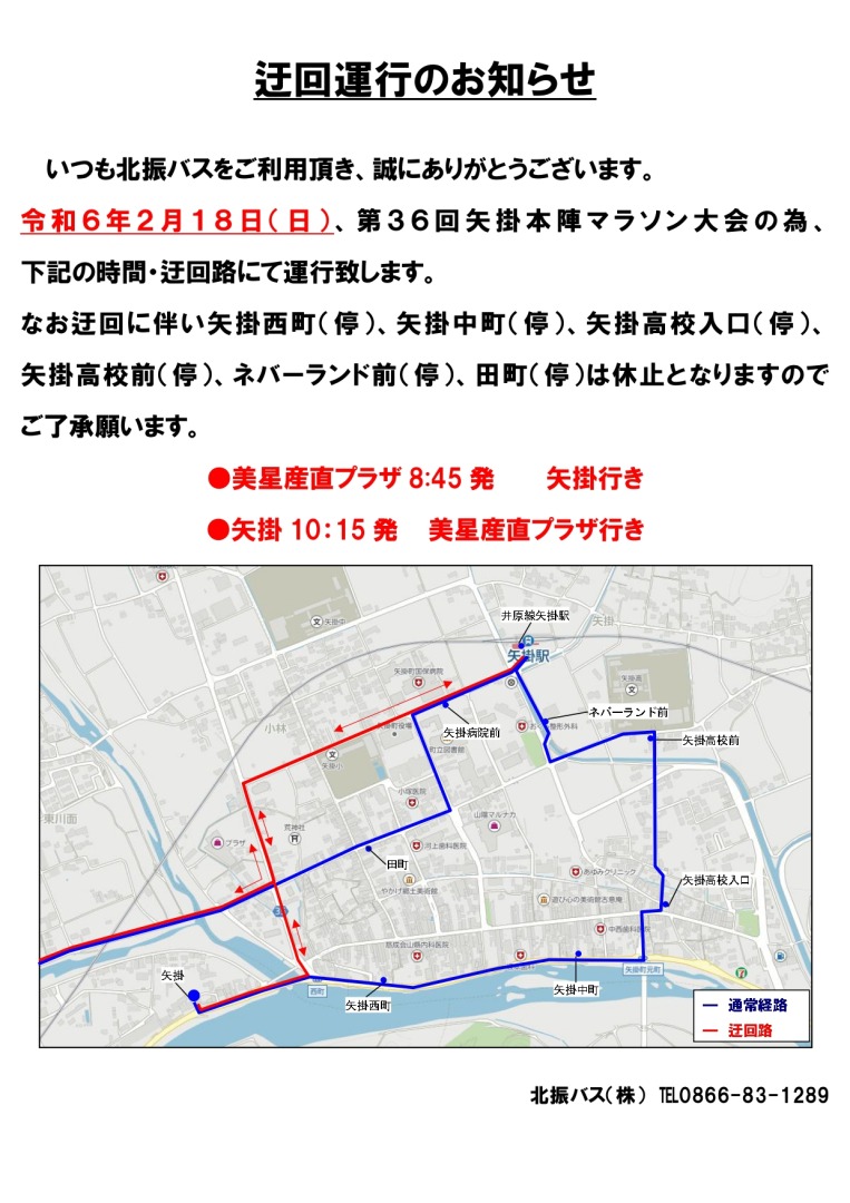 令和6年2月18日(日)「第36回矢掛本陣マラソン」開催のため、一部迂回運行致します。