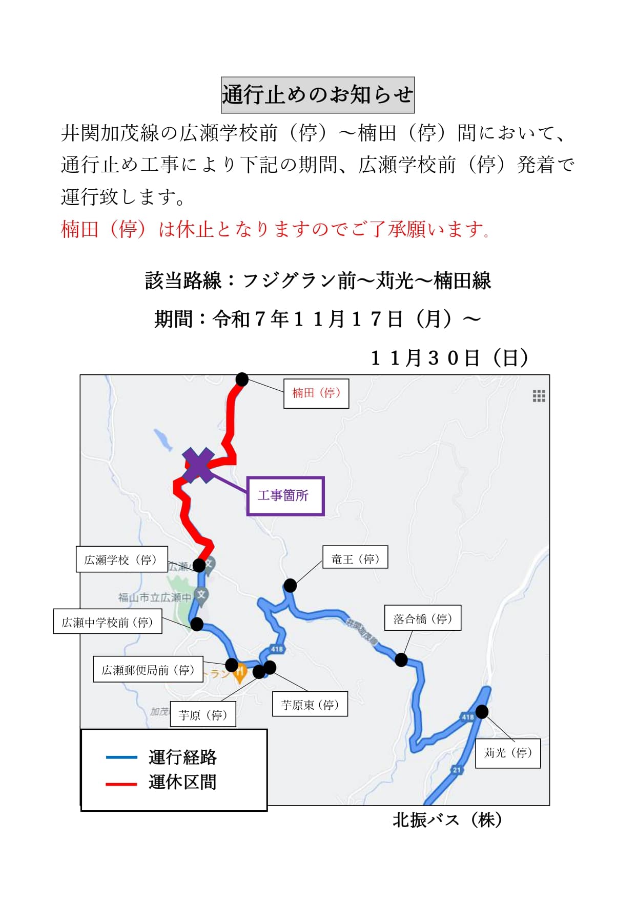 令和7年11月17日(月)~11月30日(日)において通行止め工事の為、迂回運行致します。