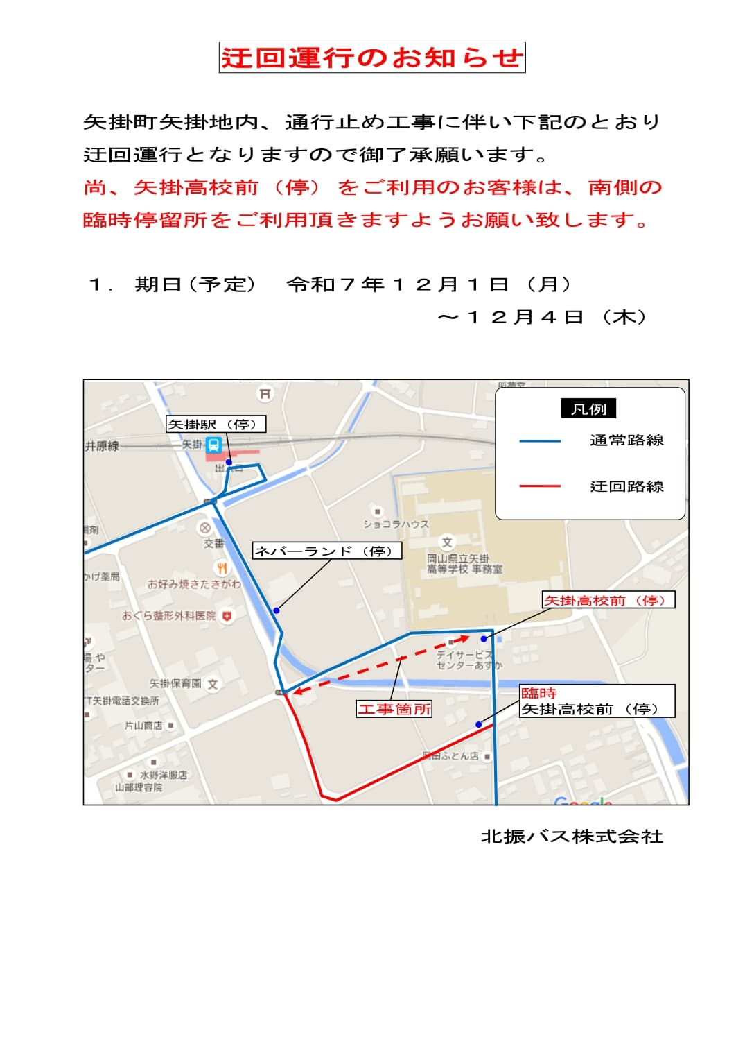 令和7年12月1日(月)~12月4日(木)において通行止め工事の為、迂回運行致します。